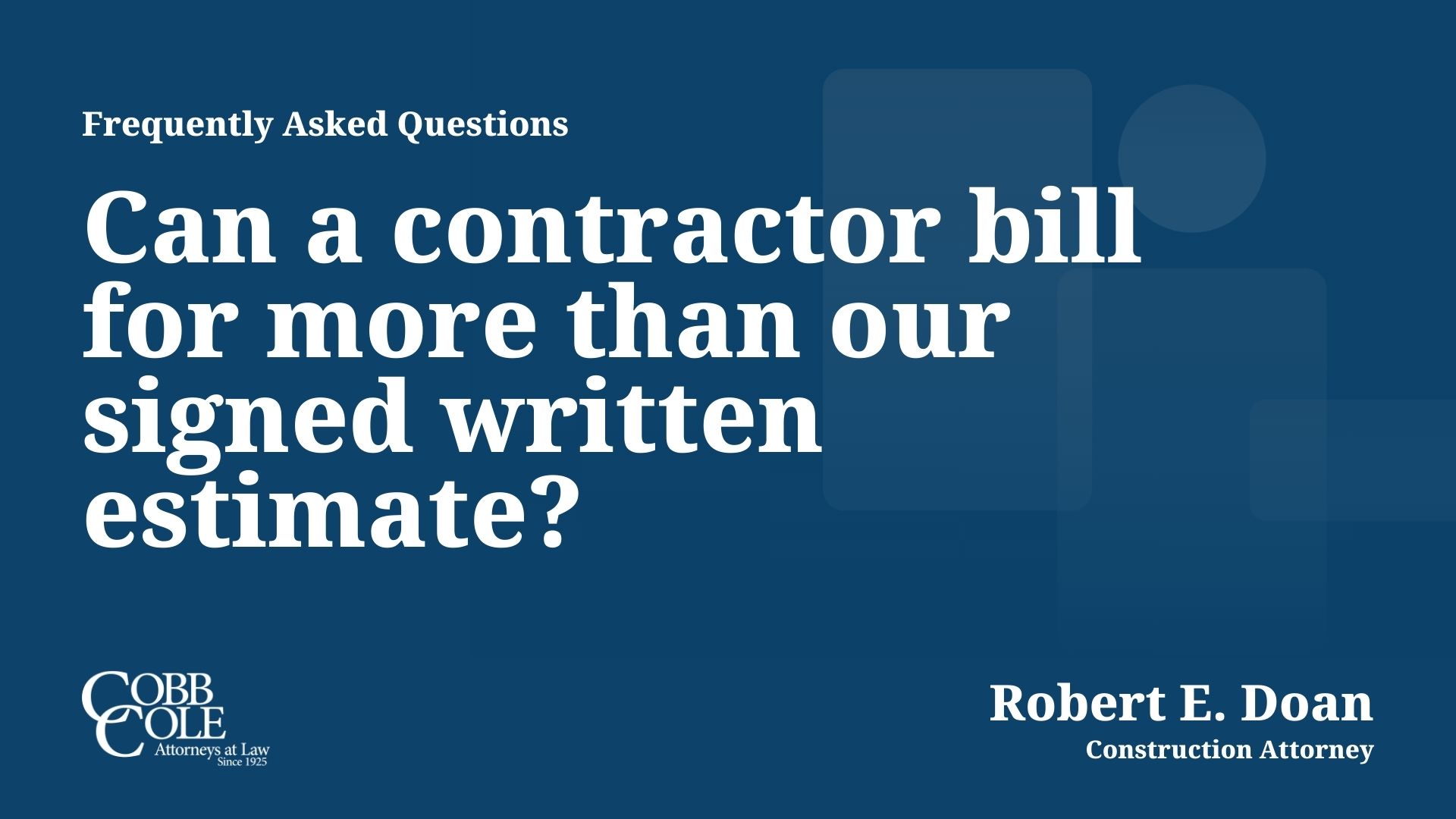 In addition, the legal team of Cobb Cole handles a wide range of business and corporate matters for construction and design firms.